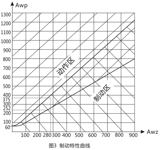 4.由動作電流與制動電流的比值所決定的制動系數Kz可以在廣泛的范圍內變化,圖3的制動特性AWp=f(AWz)是其極限范圍,它與工作電流濟口制動電流間的相位角有關,但無論在任何角下都不應越出曲線的范圍,,5.可靠系數(當一次動作電流等于5IDz的繼電器正弦動作電流與當一次動作電流等于5IDZ的正弦動作電流的比值)不小于1.35。