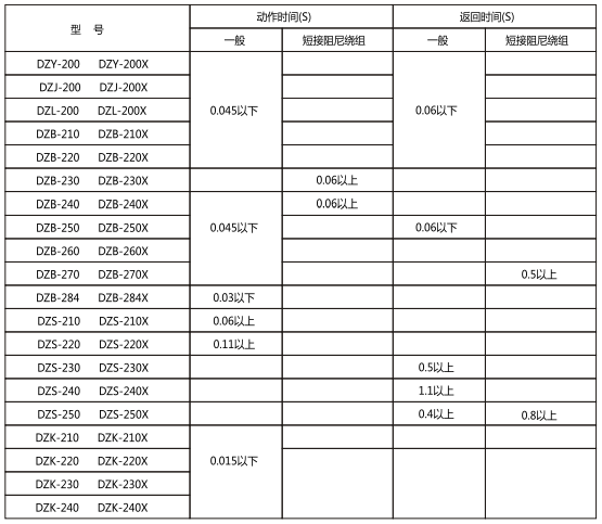 2.1動作電壓與保持電壓不大于70%額定電壓, DZY(J)-202X動作電壓不大于80%額定電壓;動作電壓不小于30%額定電壓, DZK-200及DZB 243不小于50%額定電壓。