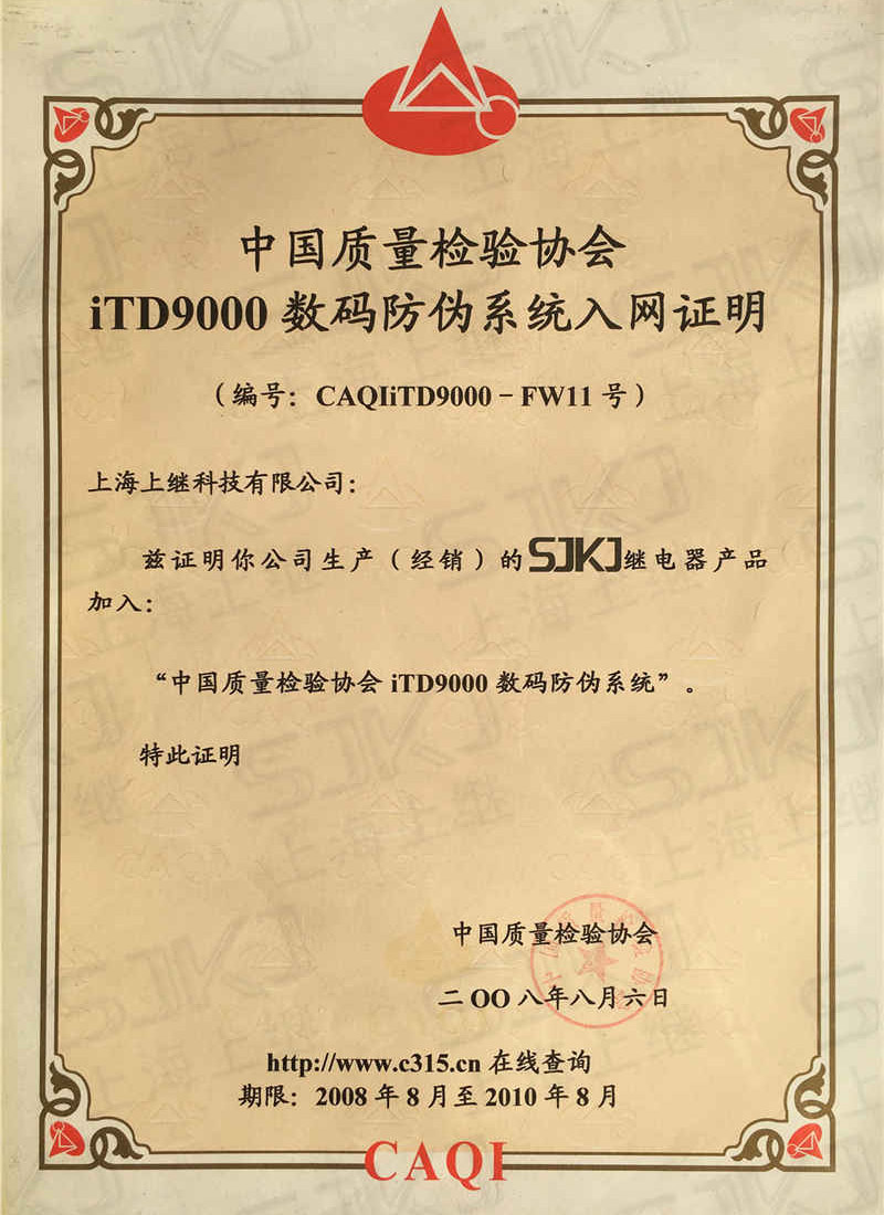 中國質量檢驗協會iTD9000數碼防偽系統入網證明